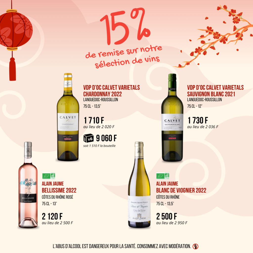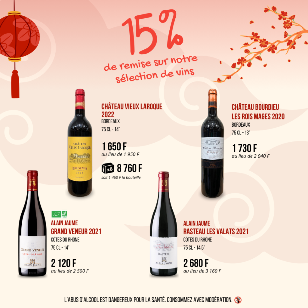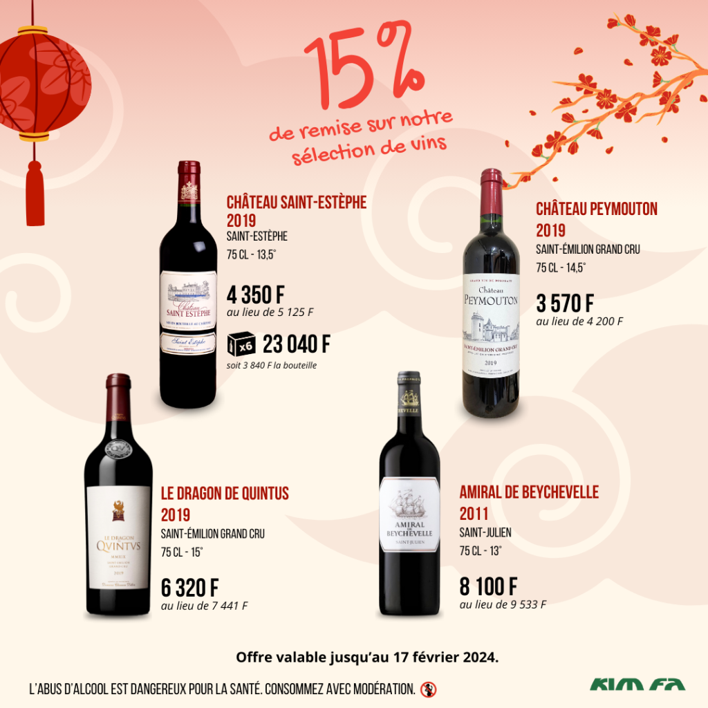 Pour cette occasion, la boutique de Kim Fa a préparé une sélection de vins en promotion valable du 31 janvier au 17 février 2024.