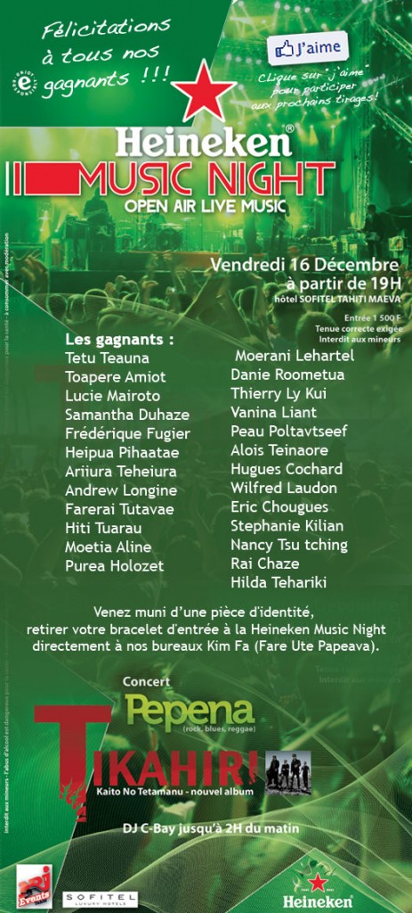 Parmi les nombreux visiteurs du site facebook.com/KimFaTahiti qui ont participé au challenge pour gagner une entrée gratuite à la Heineken Music Night, les 25 gagnants tirés au sort sont maintenant connus (voir ci-dessous). A vendredi soir, Cheers !