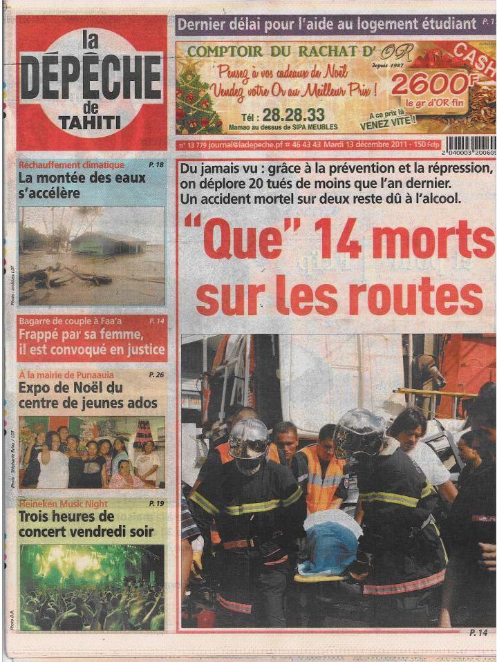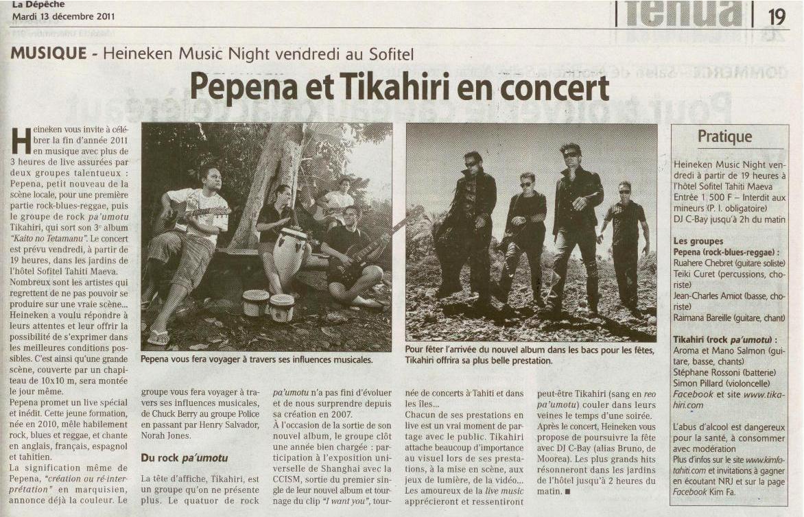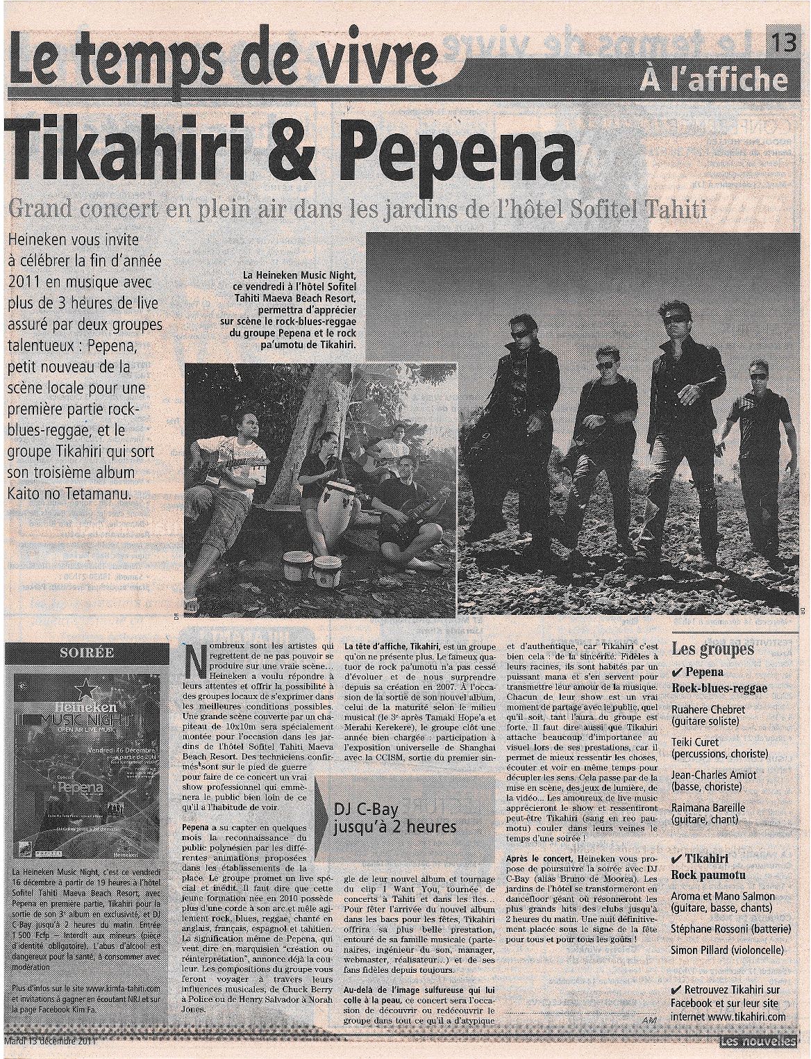 La presse quotidienne annonce la Heineken Music Night, en s’ intéressant particulièrement aux deux groupes musicaux qui se produiront vendredi 16 décembre dans le parc du Sofitel Maeva, le groupe PEPENA et le groupe TIKAHIRI. Ci-dessous: Les Nouvelles et La Dépêche de Tahiti, mardi 13 décembre: