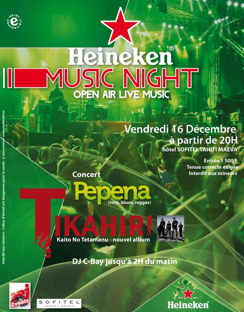 Venez nombreux à la HEINEKEN MUSIC NIGHT le vendredi 16 décembre 2011 dans le parc du Sofitel Tahiti à partir de 19H00 pour une soirée exceptionnelle ! Vous y retrouverez projeté sur écran le film Heineken diffusé mondialement, THE ENTRANCE, et vivrez une soirée pleine de surprises!