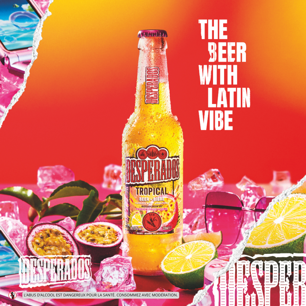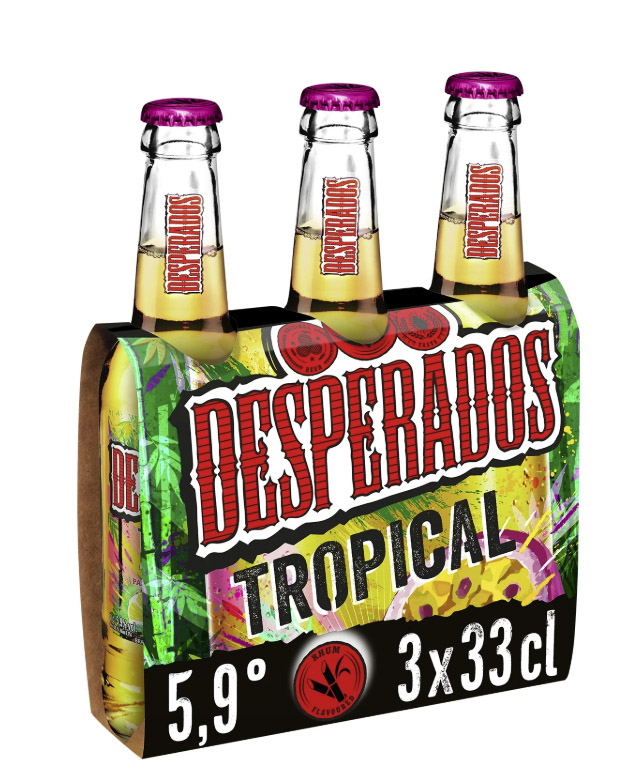 DESPERADOS TROPICAL: Desperados® se mêle aux saveurs exotiques du Rhum avec Desperados® Tropical. Son goût à la fois doux et fruité, provient de l’association d’une bière blonde avec des arômes de fruit de la passion et citron vert