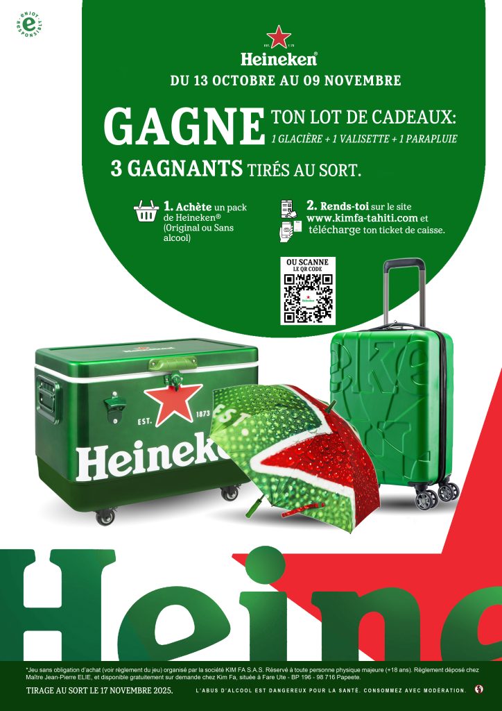 - En prenant en photo la preuve d’achat d’un pack de 6 bouteilles ou canettes de la gamme HEINEKEN (ex : Heineken 0.0 sans alcool ou Heineken original), en veillant à ce que l’enseigne, la date (comprise entre le 13 octobre et le 09 novembre 2025) et la ligne du pack HEINEKEN soient bien lisibles, puis scanner le QR code visible sur l’affiche du jeu ou se rendre directement sur le site internet www.kimfa-tahiti.com pour joindre la photo de la preuve d’achat et remplir le formulaire de participation sur ce même site. La preuve d’achat doit être un original. Clôture des participations le 09 novembre 2025 inclus.