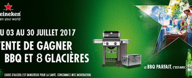 Du 03 au 30 juillet 2017, participez à notre grand jeu Heineken pour tenter de gagner un barbecue de la marque Weber, 8 glacières, ainsi que de nombreux lots.